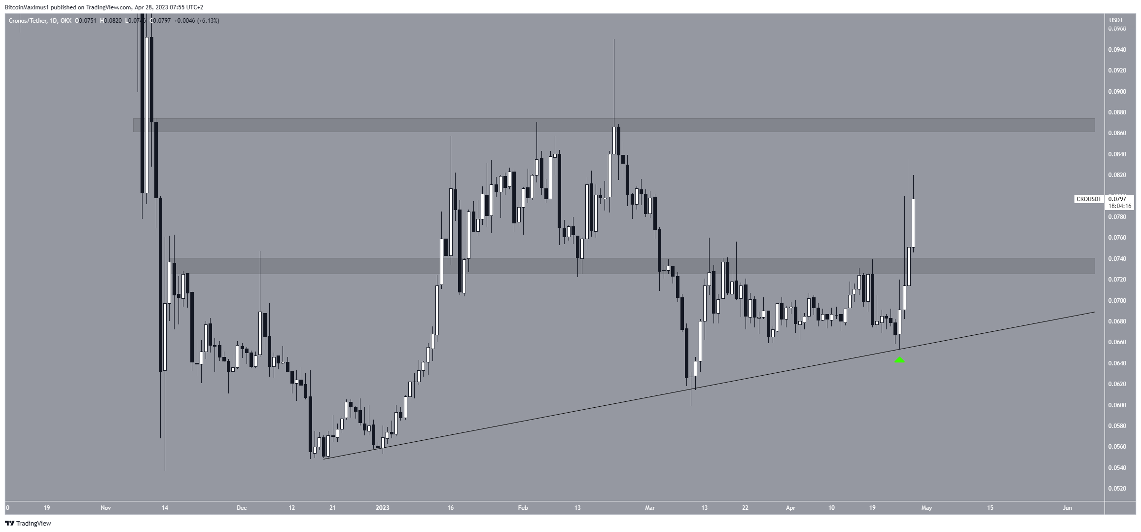 O preço do CRO aumentou ao longo de uma linha de suporte ascendente desde o início do ano. Mais recentemente, saltou na linha em 24 de abril (ícone verde).