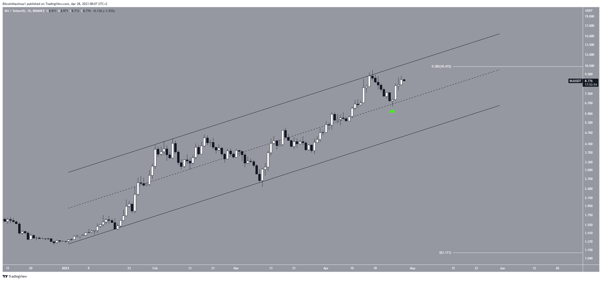 O preço INJ aumentou dentro de um canal paralelo ascendente desde o início do ano. Um canal paralelo ascendente é um tipo de padrão corretivo, no qual o preço salta entre duas linhas paralelas antes de eventualmente quebrar na maioria das vezes.