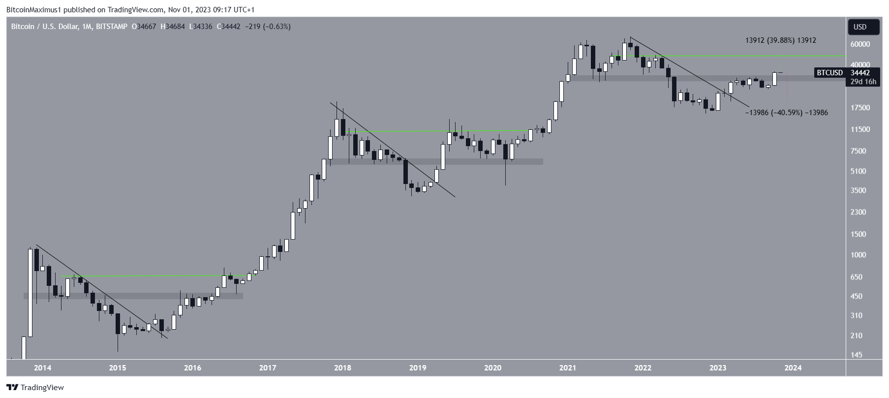 O Bitcoin disparou em outubro, atingindo uma nova máxima anual de US$ 35.198. O salto foi crucial, pois causou um rompimento da área horizontal de US$ 30.000, que atuava como resistência.