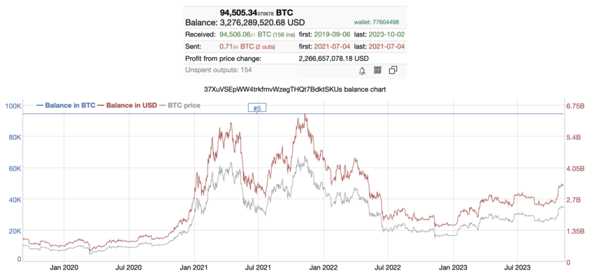 Desde que uma parte desconhecida enviou 94.905 Bitcoins (US$ 1,1 bilhão) para ela em 6 de setembro de 2019, o saldo desta carteira quase não mudou. Seu proprietário retirou 0,71 Bitcoin (US$ 25.000) em 4 de julho de 2021.