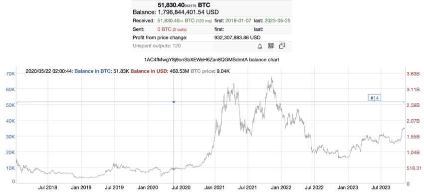 Nenhum BTC foi sacado desde que o endereço recebeu seu último depósito de 53.880 BTC em 28 de maio de 2023. No entanto, a carteira recebe uma pequena quantidade de Bitcoin algumas vezes por mês, sugerindo que seu proprietário usa a criptomoeda para obter renda passiva. Os depósitos provavelmente ocorrem automaticamente.