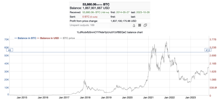 A maior parte do Bitcoin do endereço foi depositada em 7 de janeiro de 2018, depois que o ativo atingiu seu preço recorde de US$ 20.000. A última atividade foi registrada em 17 de março de 2023, quando a baleia recebeu 0,03 BTC.