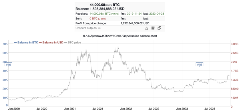 A última baleia, no endereço 1LruNZjwamWJXThX2Y8C2d47QqhAkkc5os, está listada em 14º lugar no Bitinfocharts. A atividade desta carteira pode ser resumida da seguinte forma: