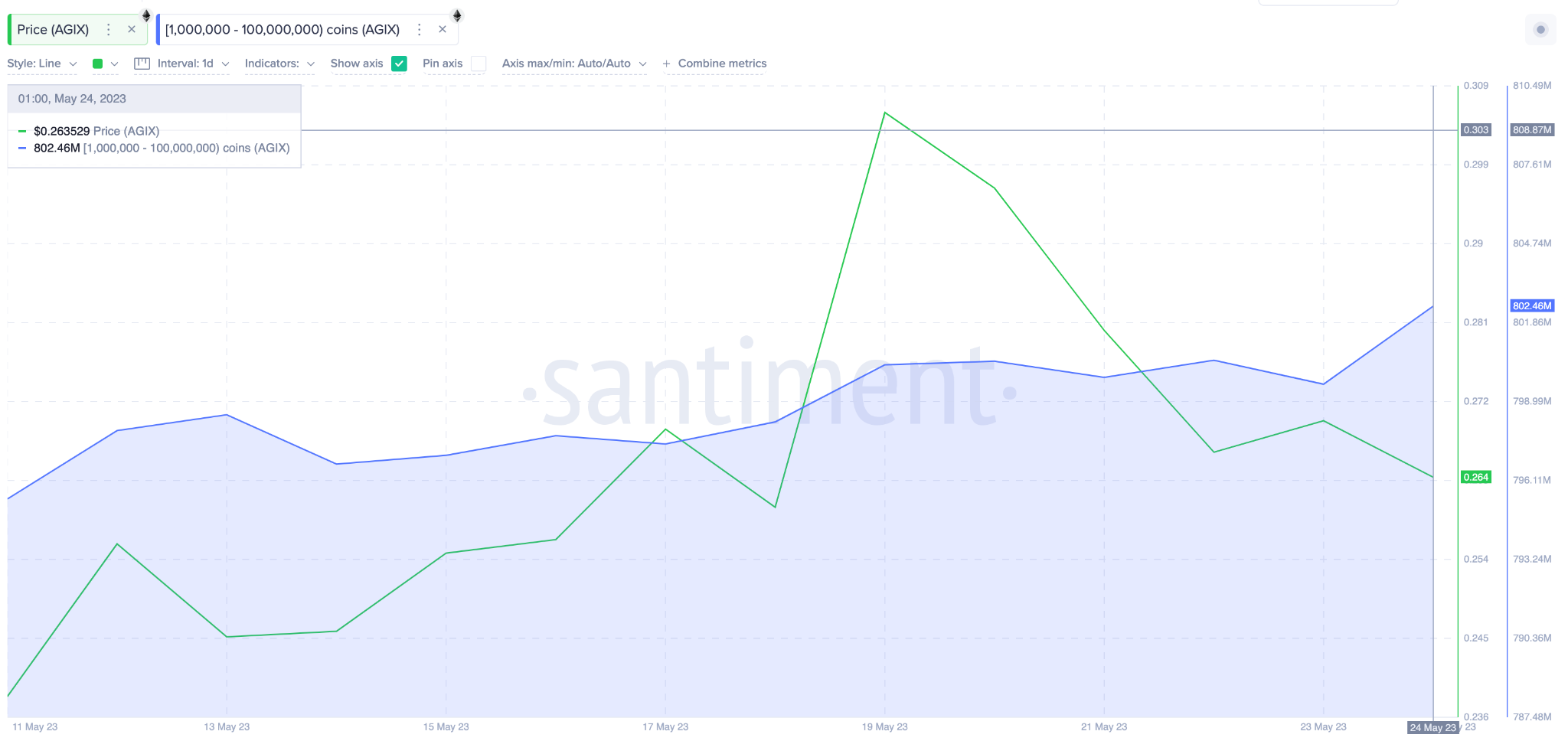 Entre 11 de maio e 25 de maio, as baleias com saldos de um milhão a 10 milhões de tokens AGIX tiveram algum acúmulo significativo. O gráfico abaixo mostra como eles adicionaram mais de 7 milhões de AGIX aos seus saldos durante esse período.