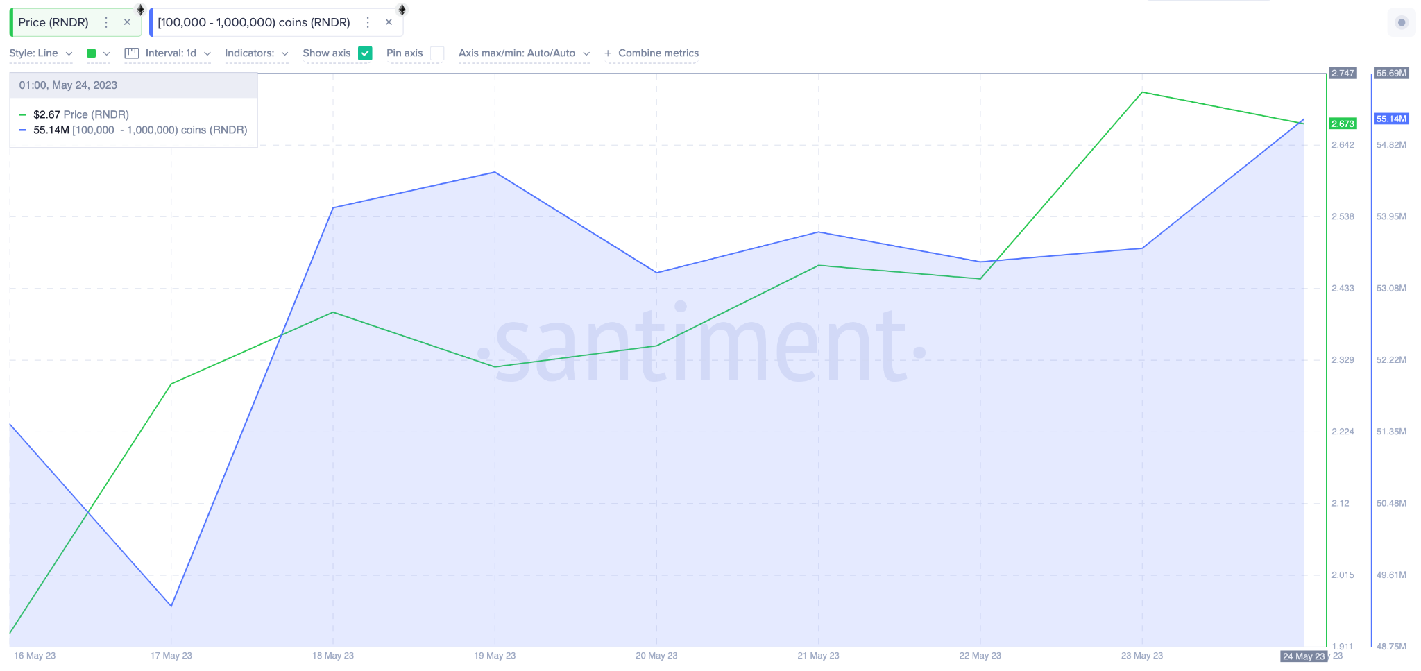 Os tokens recém-adicionados valem aproximadamente US$ 16,7 milhões aos preços atuais de mercado. Notavelmente, isso contribuiu para impulsionar o RNDR a um novo pico de US$ 2,67 em 2023 em 25 de maio, elevando seus ganhos acumulados no ano para notáveis 575%.