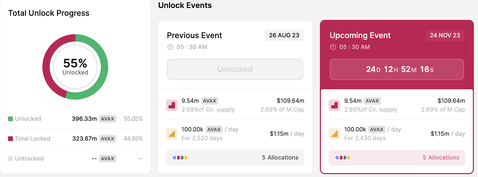 A Avalanche lançará 9,54 milhões de tokens, no valor de US$ 109,64 milhões, em 24 de novembro. Os tokens programados para desbloqueio representam 2,69% de sua oferta circulante.