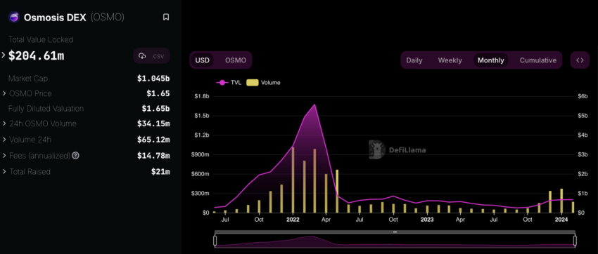 A Osmosis chama a atenção como a principal camada de liquidez do ecossistema Cosmos. Com um volume de negociações acumulado de US$ 7,7 bilhões. A capacidade da plataforma de atrair aproximadamente 45.000 usuários ativos diariamente em seu pico indica seu papel crítico na facilitação de transações DeFi em todo ecossistema Cosmos.