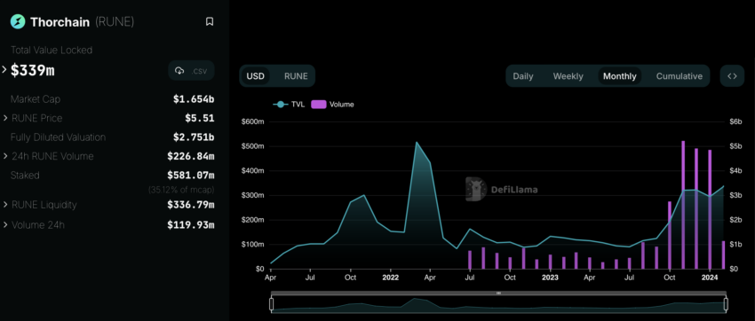 Recuperando-se de vulnerabilidades de segurança iniciais, a THORChain introduziu recursos como streaming swaps para reduzir o slippage. Seu volume diário de swap atingiu máximas de US$ 382 milhões. Enquanto isso, um TVL de US$ 330 milhões demonstra participação e liquidez robustas.