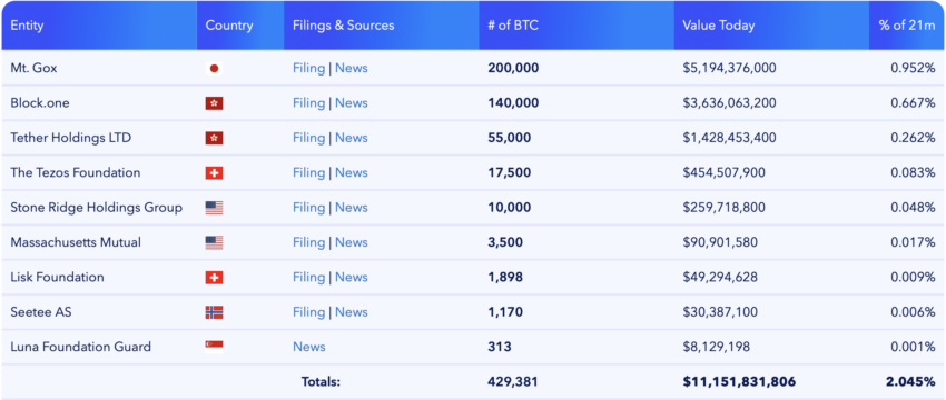 Outras oito entidades privadas são responsáveis por cerca de 1,1% do fornecimento de BTC, enquanto as autoridades dos EUA e China controlam a maioria do fornecimento de 2% detido pelos governos.