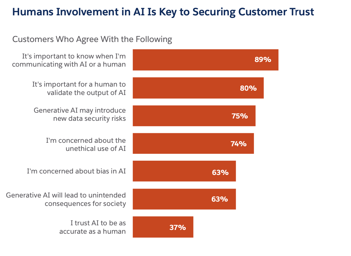 Além disso, a pesquisa revela que os consumidores estão preocupados com os riscos de segurança dos dados. Mais de 89% dos consumidores acreditam que é importante saber se eles se comunicam com uma inteligência artificial ou com um ser humano.