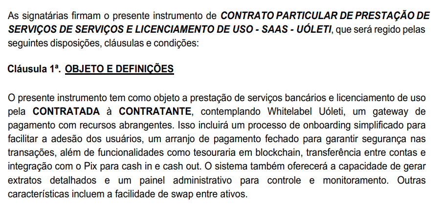 Tivemos conhecimento deste contrato, apenas quando do ajuizamento da ação de cobrança. Trata-se de um contrato de prestação de serviços, elaborado pela empresa que está sendo processada. Provavelmente confundiram Wallet com UÓLETI, o que é um indício que não estavam preparados para prestação dos complexos serviços oferecidos.