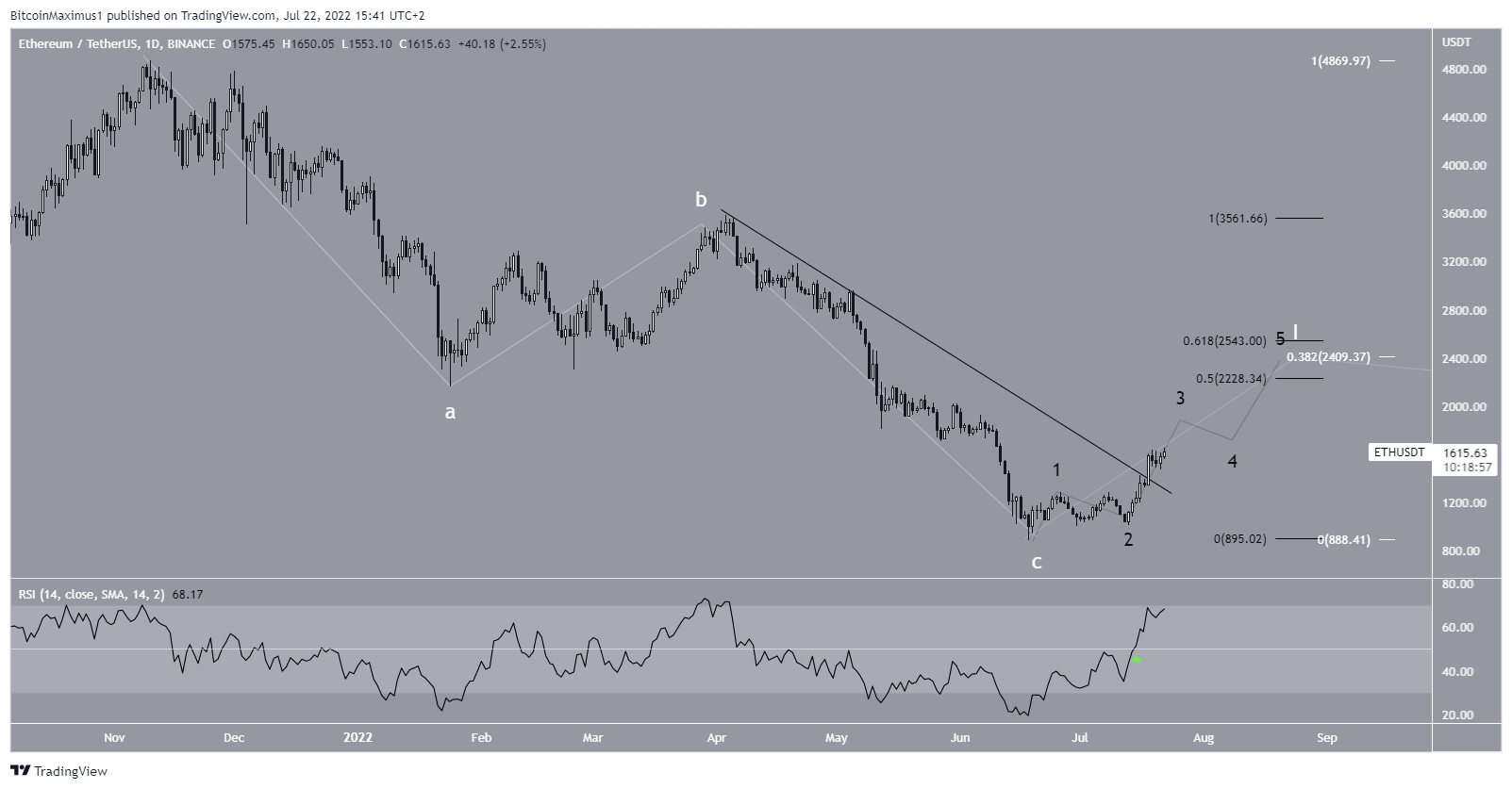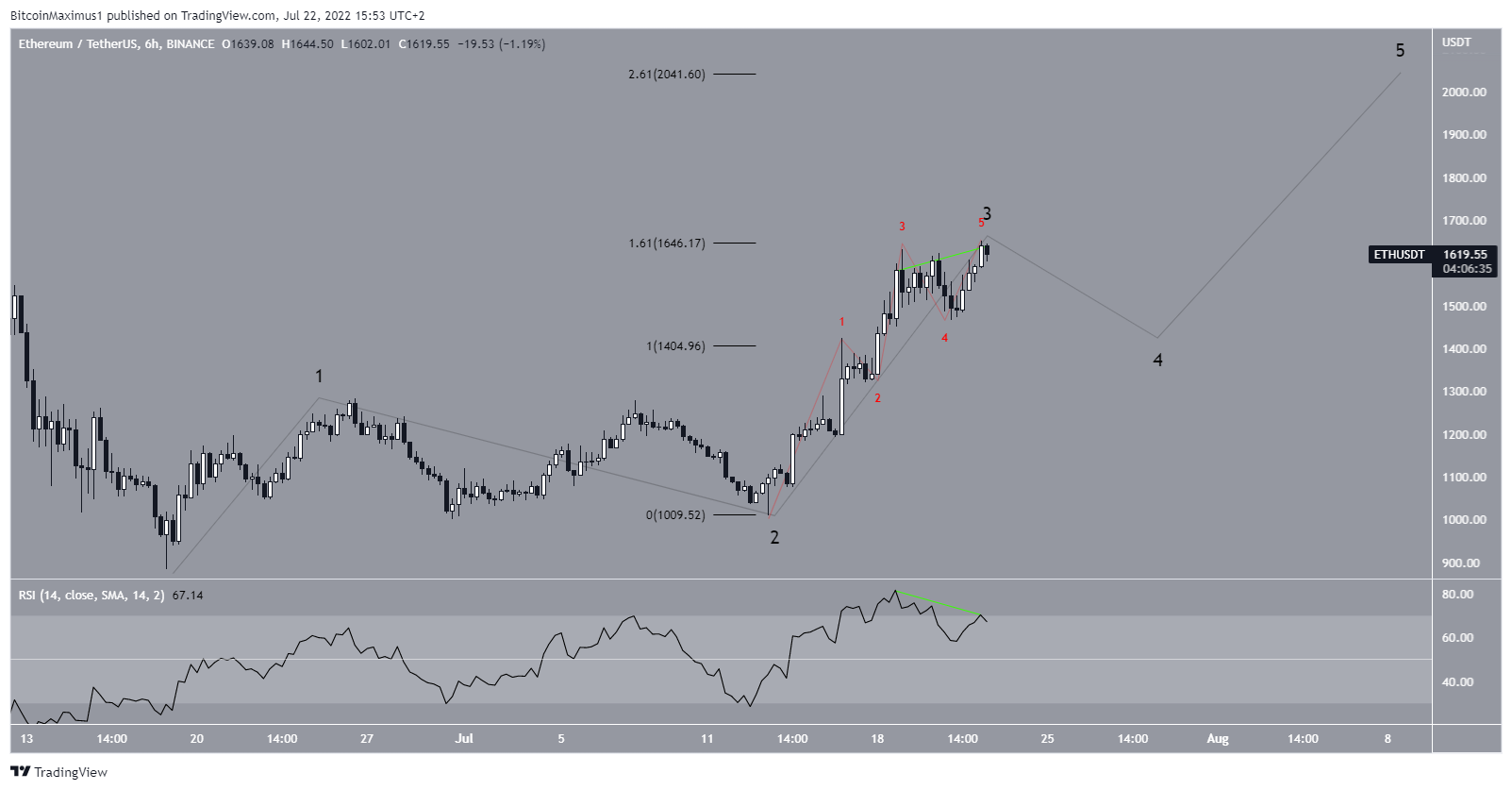 Por fim, um olhar mais atento à contagem de sub-ondas delineada anteriormente mostra que o ETH provavelmente está na onda três de um movimento de alta de cinco ondas. Até agora, a sub-onda três teve 1,61 vezes o comprimento da sub-onda um, o que é comum em tais estruturas.