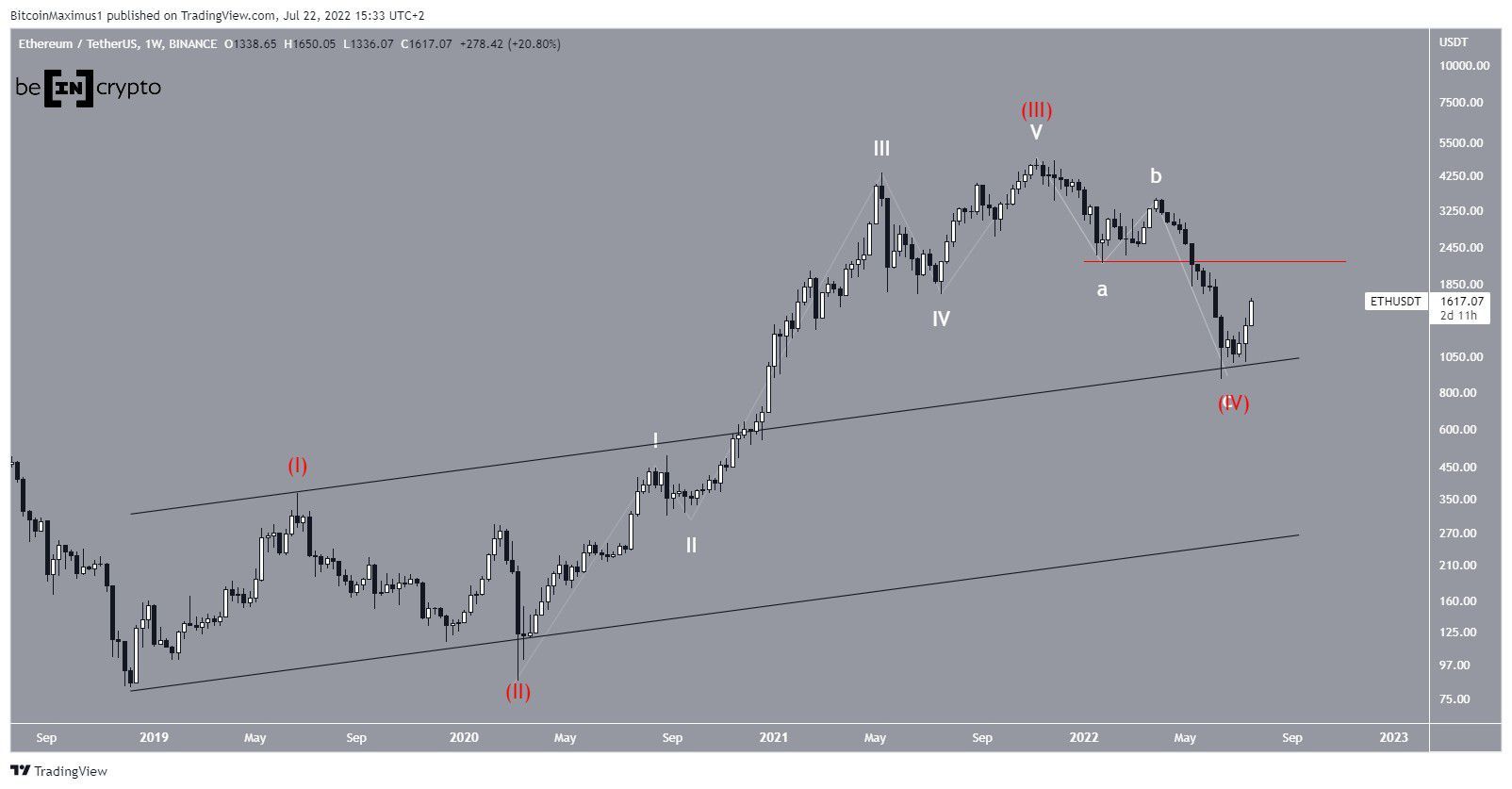 Se essa contagem estiver correta, o preço iniciou um novo movimento de alta que eventualmente levará a uma nova máxima histórica. Para que a contagem seja confirmada, o Ethereum precisa se mover acima da onda um de baixa (linha vermelha), em US$ 2.159.