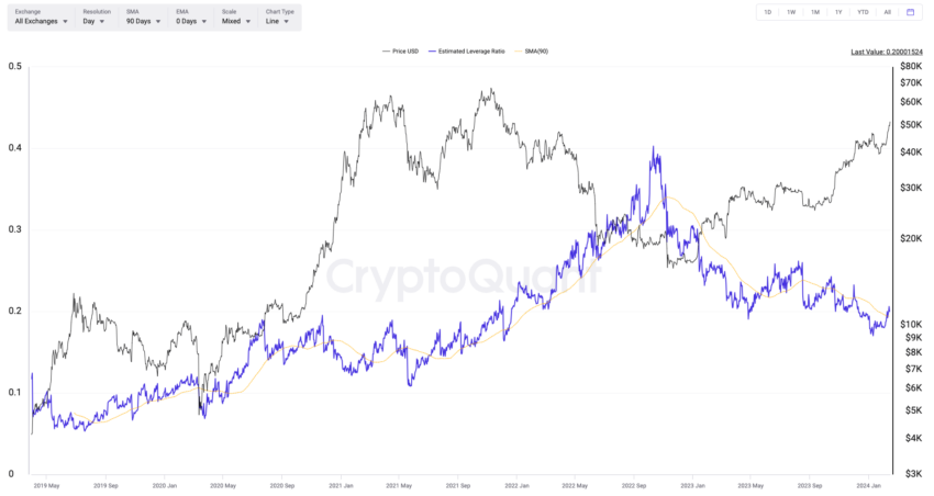 No entanto, é improvável que o aumento nos contratos em aberto para futuros de Bitcoin cause uma queda de preços, de acordo com dados da CoinGlass. Embora os níveis de alavancagem tenham subido ligeiramente de 0,18 para 0,2 nas últimas semanas, estão longe dos níveis observados em agosto do ano passado.
