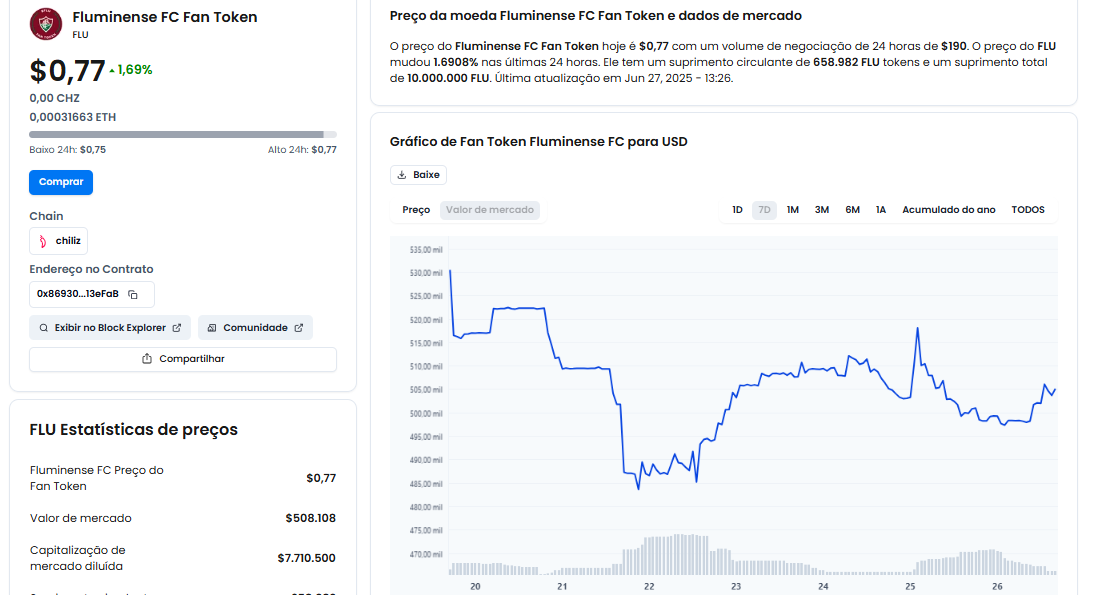 Já o $FLU, token do Fluminense, não teve uma performance significativa no jogo que terminou empatado com o Sundowns. Desde a vitória sobre o Ulsan Hyundai por 4 a 2, o valor de mercado do $FLU vem enfrentado um rali.
