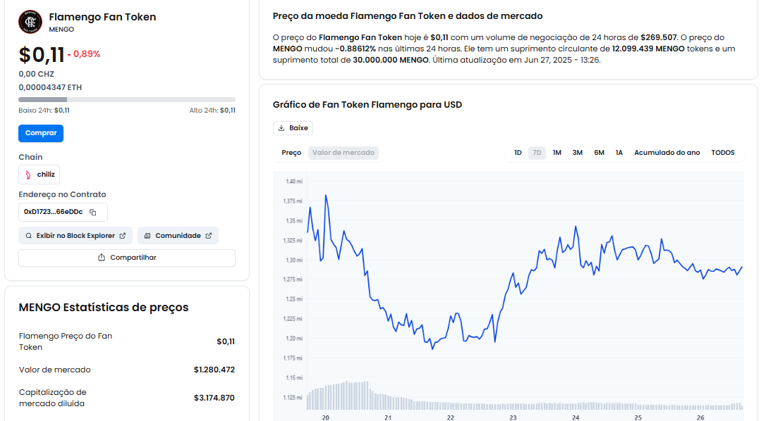 Entre os três clubes que estão na disputa, o Flamengo foi o que teve a maior performance no âmbito digital. Em 2021, o time criou o $MENGO e, durante o jogo contra o Chelsea na sexta-feira (20), a cripto valorizou 12%. Neste momento, o $MENGO está cotado a R$ 0,60, e seu valor de mercado corresponde a US$ 1.282.855.