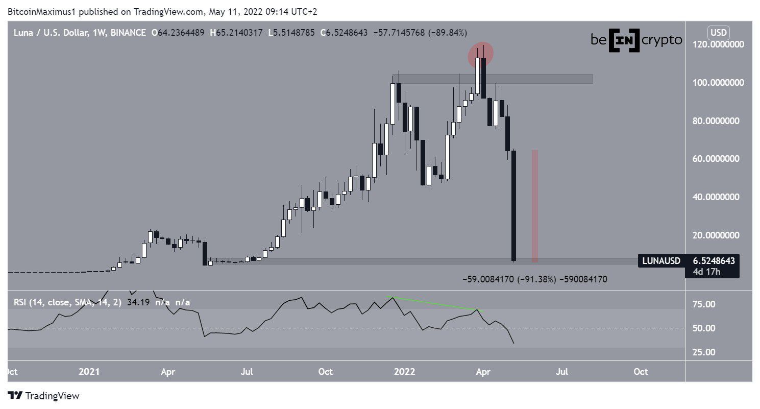 A LUNA vem caindo desde que atingiu uma alta histórica de US$ 119,55 em 5 de abril. A queda fez com que a quebra acima da área horizontal de US$ 105 fosse apenas um desvio (círculo vermelho). A queda também foi precedida por uma divergência de baixa no RSI semanal (linha verde).