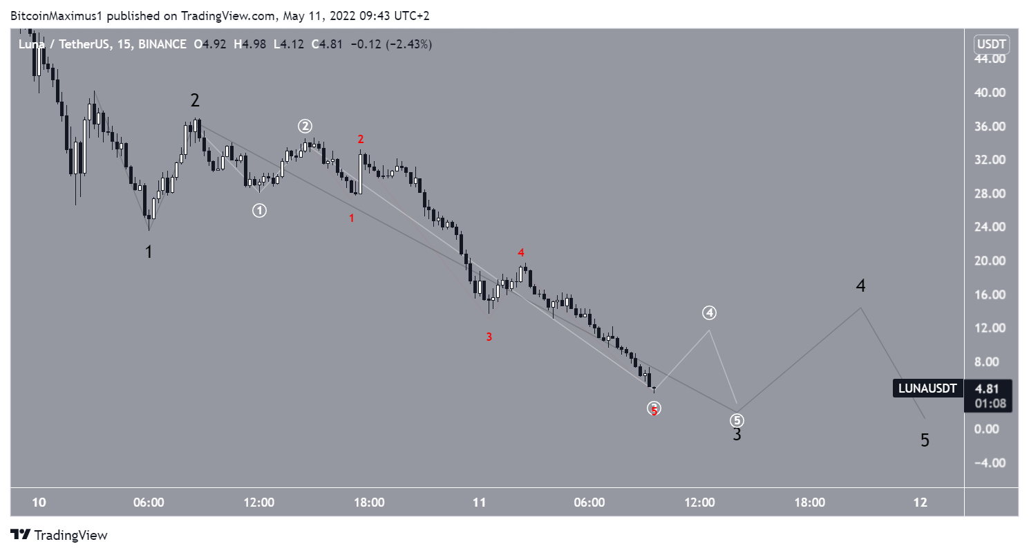 A contagem de ondas sugere que a LUNA está atolada em um movimento descendente de cinco ondas muito íngreme, dos quais está na onda três (preta). As contagens de sub-onda e sub-onda menor são fornecidas em vermelho e branco, respectivamente, no gráfico abaixo.