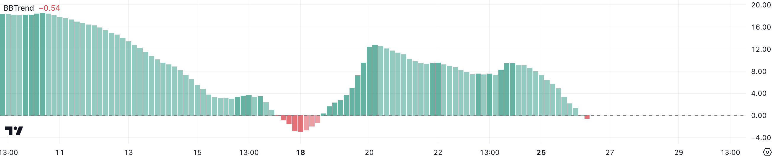 O BBTrend da Solana se tornou negativo pela primeira vez desde 18 de novembro, atualmente em -0,54. O Bollinger Bands Trend, mede o momento e a direção do movimento de preço em relação às Bandas de Bollinger. Assim, valores positivos indicam tendências de alta e valores negativos sugerem tendências de baixa.
