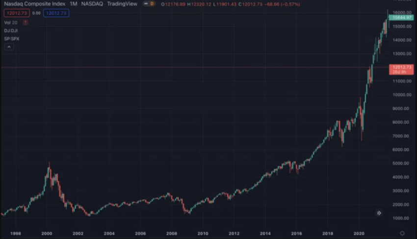 Em 2000, o índice de ações Nasdaq Composite caiu 75%.