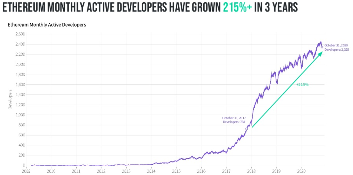 No terceiro trimestre de 2020, haviam pouco menos de 400 desenvolvedores trabalhando no blockchain do bitcoin. Quando olhamos para o Ethereum nesse mesmo período, o número sobe para uma média de 2.300 desenvolvedores.