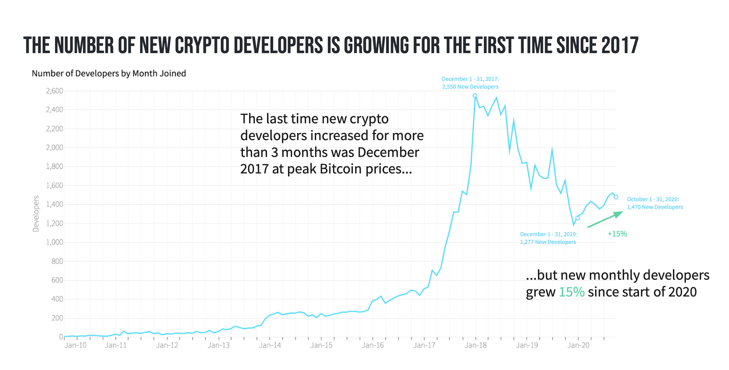Em 2020, cresceu 15% o número mensal de novos desenvolvedores programando para o mercado cripto. O aumento é expressivo porque supera pela primeira vez os números registrados há três anos atrás.