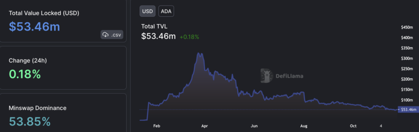 Dados do DefiLlama sugeriram que o TVL da Cardano oscilou em torno da marca de US$ 53,46 milhões. Seu TVL caiu 83% em relação à máxima histórica.