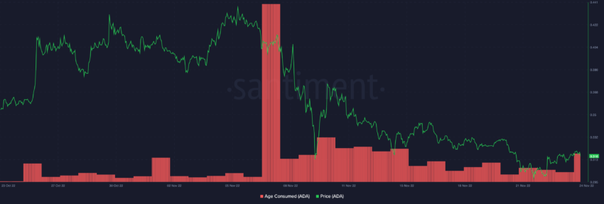 A recente volatilidade de curto prazo no preço da Cardano parecia colocar algumas moedas antigas de volta em circulação. A métrica Age Consumed destacou que, após a ação do preço se tornar de baixa, uma quantidade notável de ADA antiga foi movida.