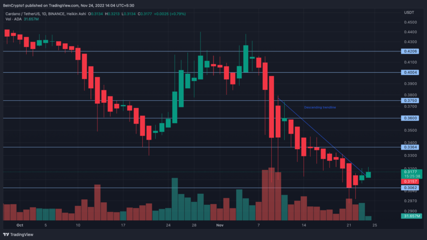 A ação do preço da Cardano (ADA) ofereceu algum otimismo aos detentores, já que o ativo conseguiu se manter acima de uma linha de tendência de baixa.