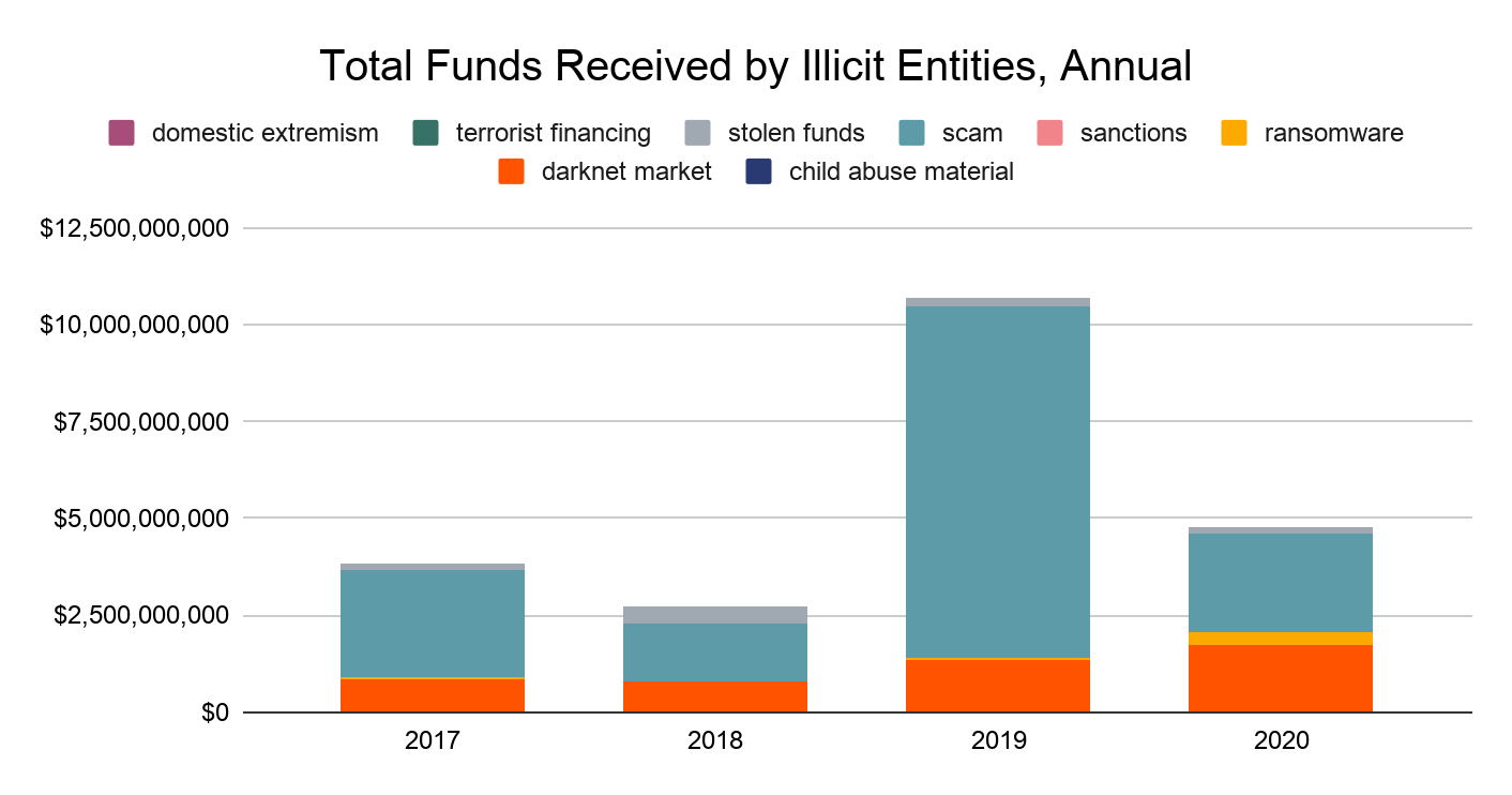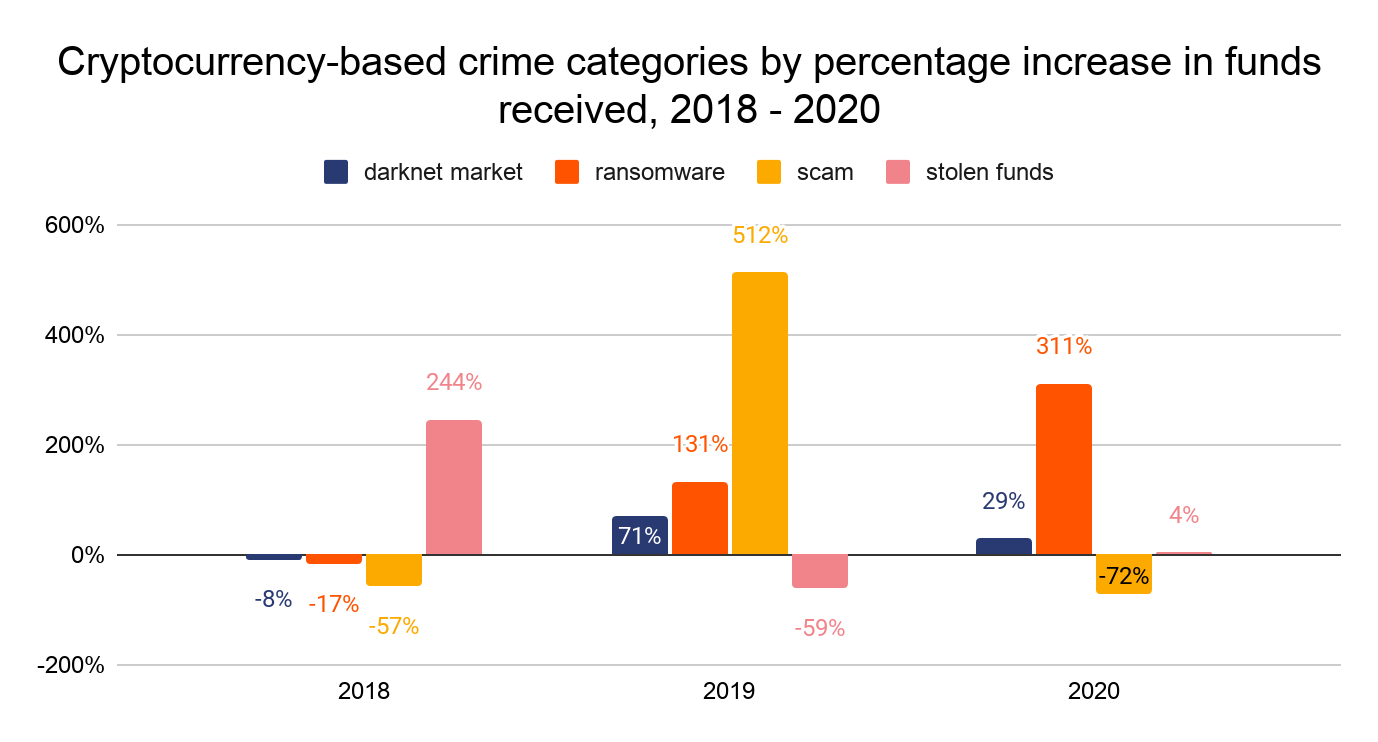Em 2019, criminosos enviaram e receberam aproximadamente US$ 21,4 bilhões em criptomoedas. Um ano depois, segundo a Chainalysis, o número caiu para, aproximadamente US$ 10 bilhões.