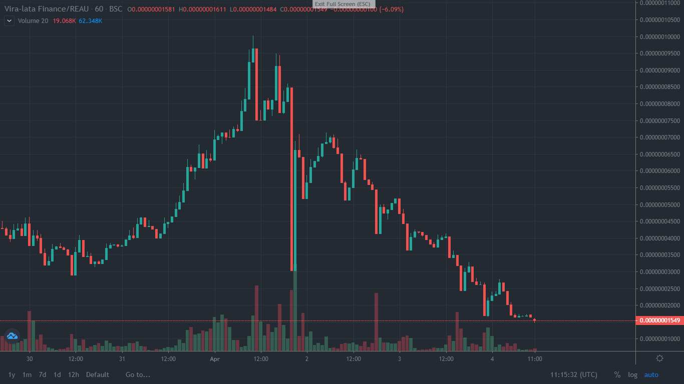 O movimento começou ainda na manhã de quinta-feira (1). Por volta das 8h, o preço da REAU recuou 22,11%, de 0,00000009630 BNB para 0,00000007500 BNB, no período de uma hora.