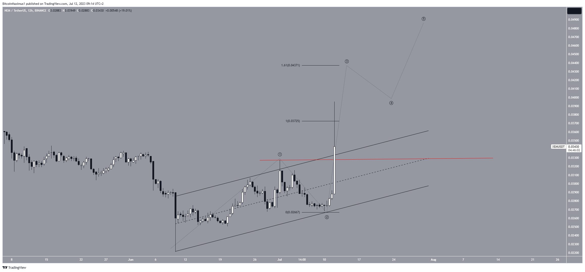 Apesar dessa previsão de alta, uma queda abaixo da onda um (linha vermelha) de US$ 0,033 significará que a tendência é de baixa. O XEM pode então cair para o suporte mais próximo em US$ 0,030 se isso ocorrer.