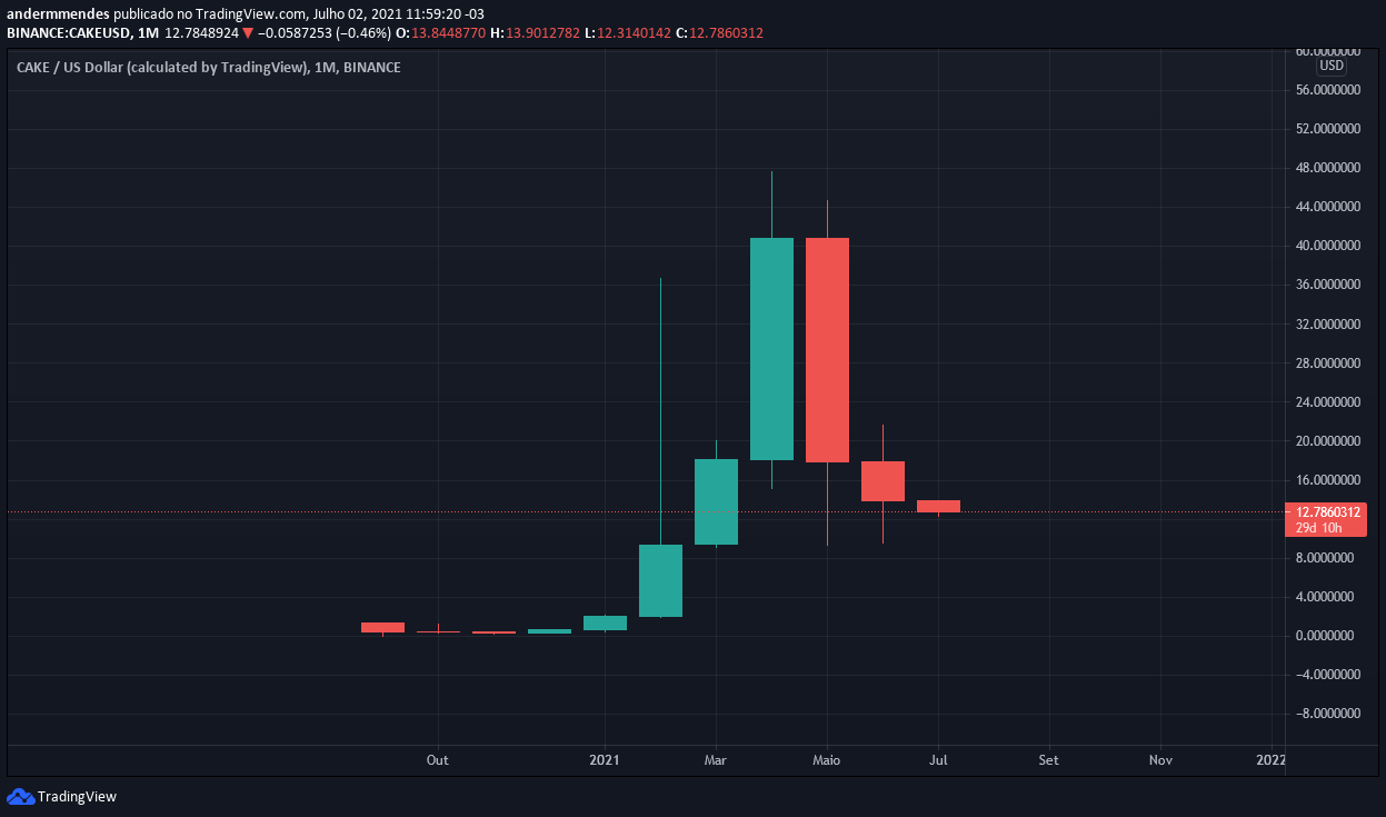 O CAKE, token utilitário da exchange descentralizada (DEX) PancakeSwap, teve uma grande alta a partir de fevereiro deste ano. A moeda, que iniciou o ano sendo cotada em US$ 0,65, atingiu uma máxima histórica de US$ 43,96 no dia 30 de abril – ganhos de 6.663%.