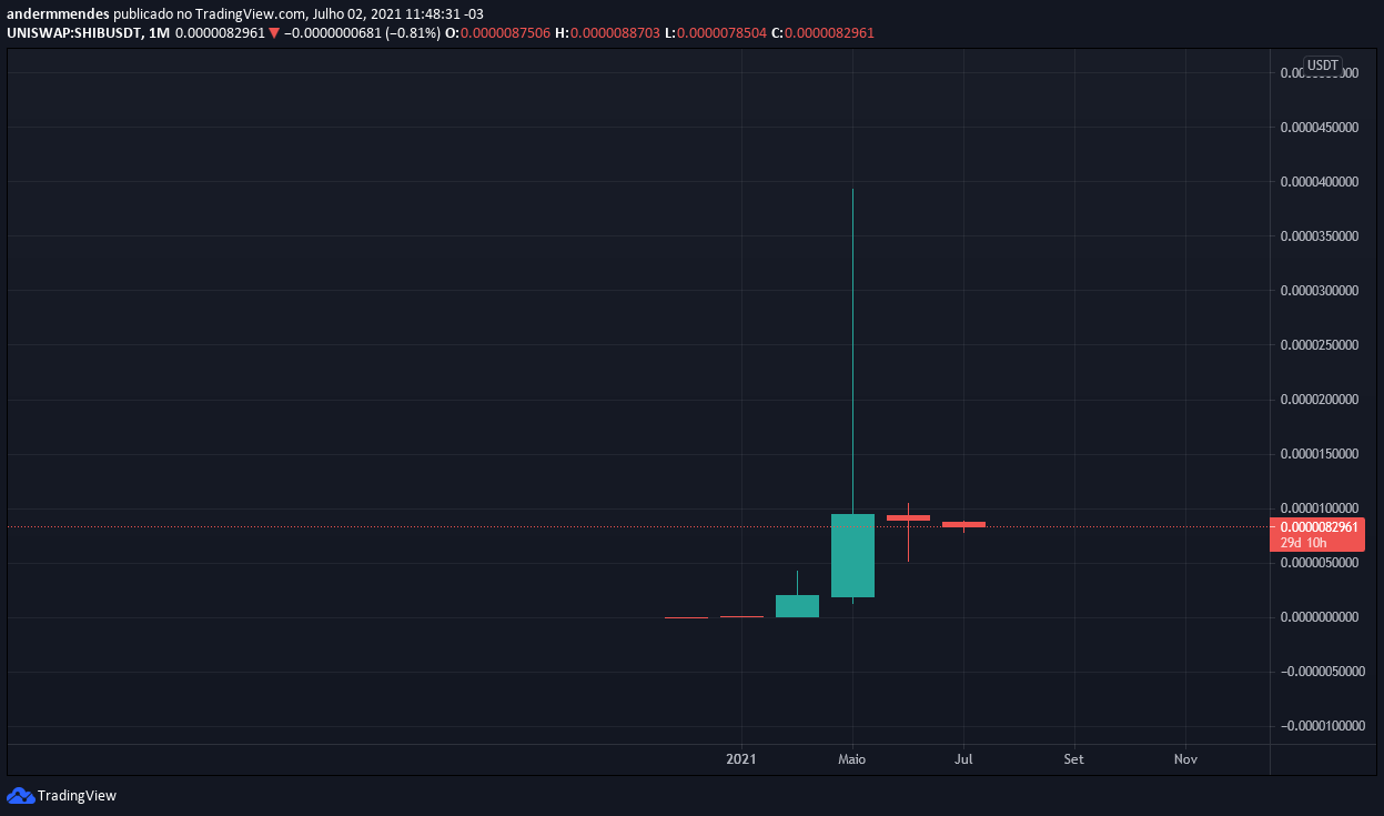 O token, que no dia 1º de janeiro era negociado a singelos US$ 0,000000000077, desempenhou uma alta impressionante de quase 50.000.000% (ou 500.000 vezes) até a máxima histórica de US$ 0,000037910000.