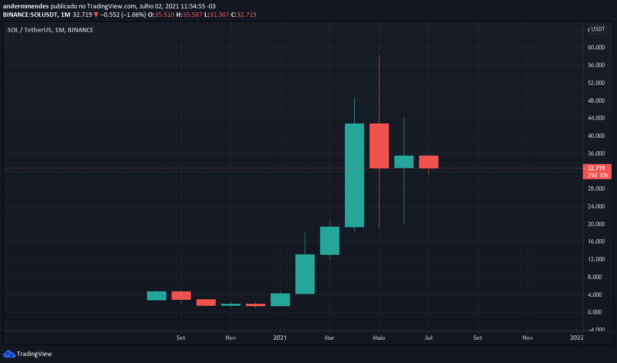 O projeto Solana (SOL) conseguiu uma grande popularização no mercado em 2021, após crescer no setor de finanças descentralizadas (DeFi) e NFT como uma das alternativas à Ethereum (ETH). Por conta disso, o preço da criptomoeda disparou, indo de US$ 1,84 no início de janeiro para a máxima histórica de US$ 58,03 em maio, uma alta de 3.053%.