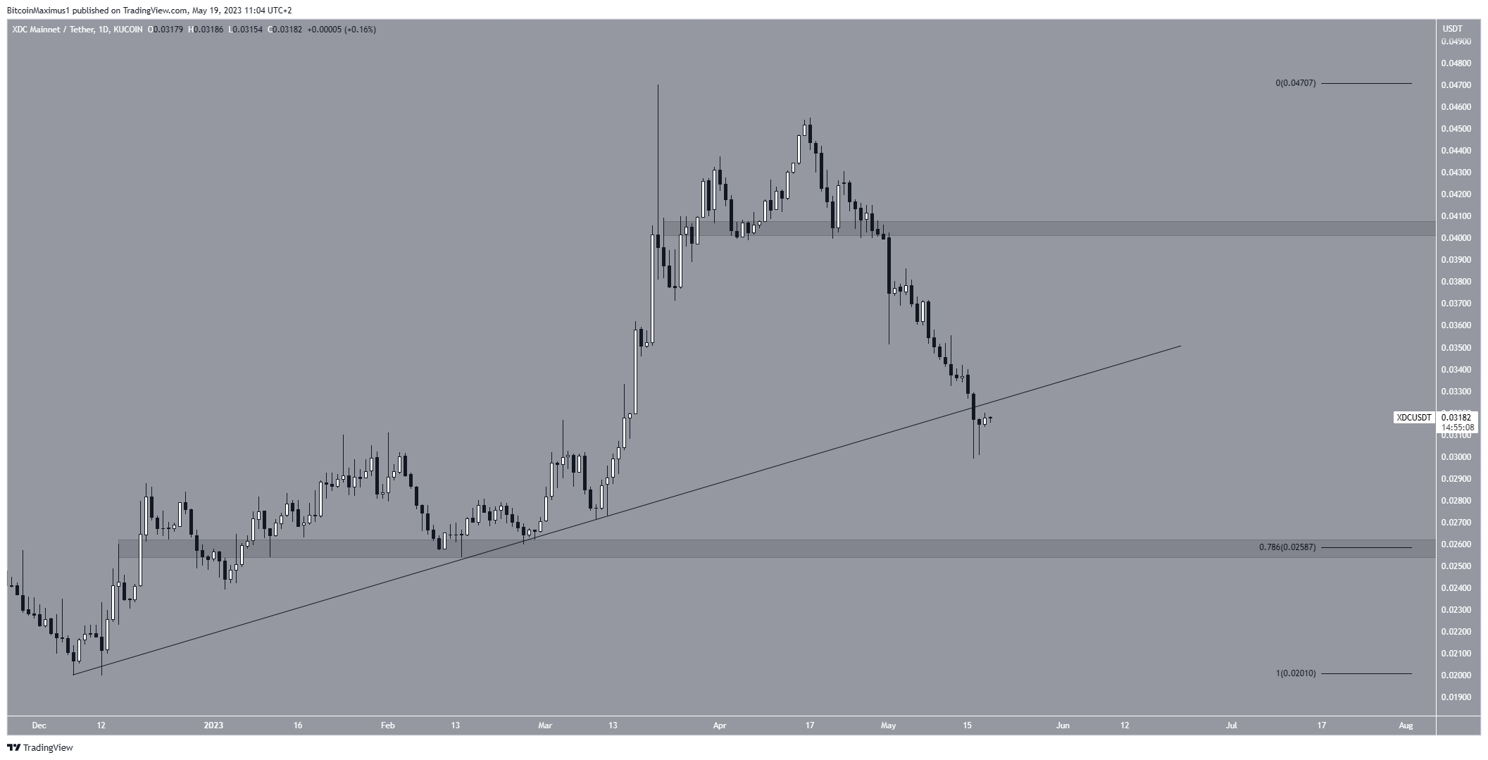 A XDC caiu desde sua máxima anual de US$ 0,047 em 21 de março. A queda causou uma quebra de uma linha de suporte ascendente em 17 de maio.