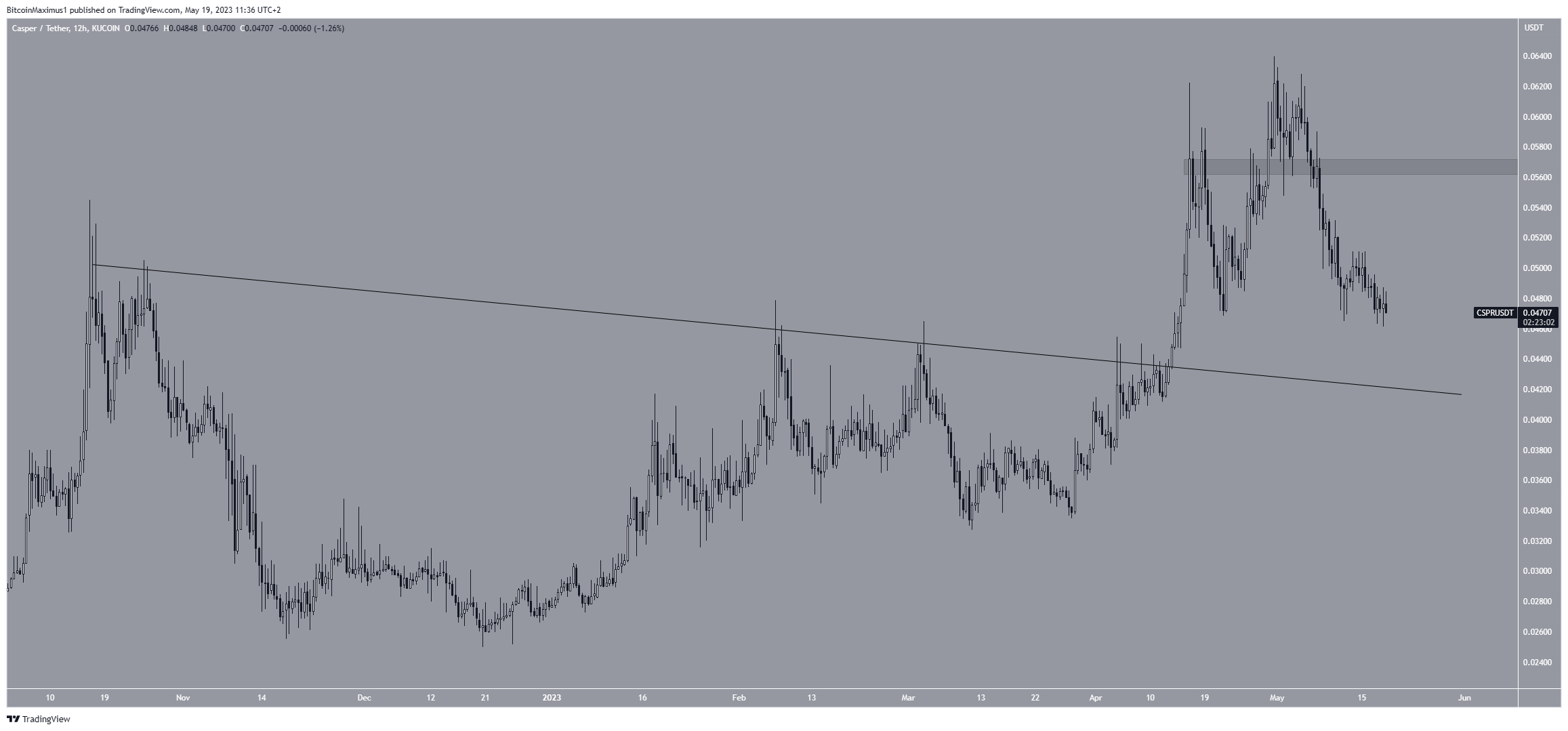 O Casper (CSPR) caiu desde que atingiu sua máxima anual de US$ 0,063 em 30 de abril. A queda levou o ativo a uma mínima de US$ 0,046 em 18 de maio.