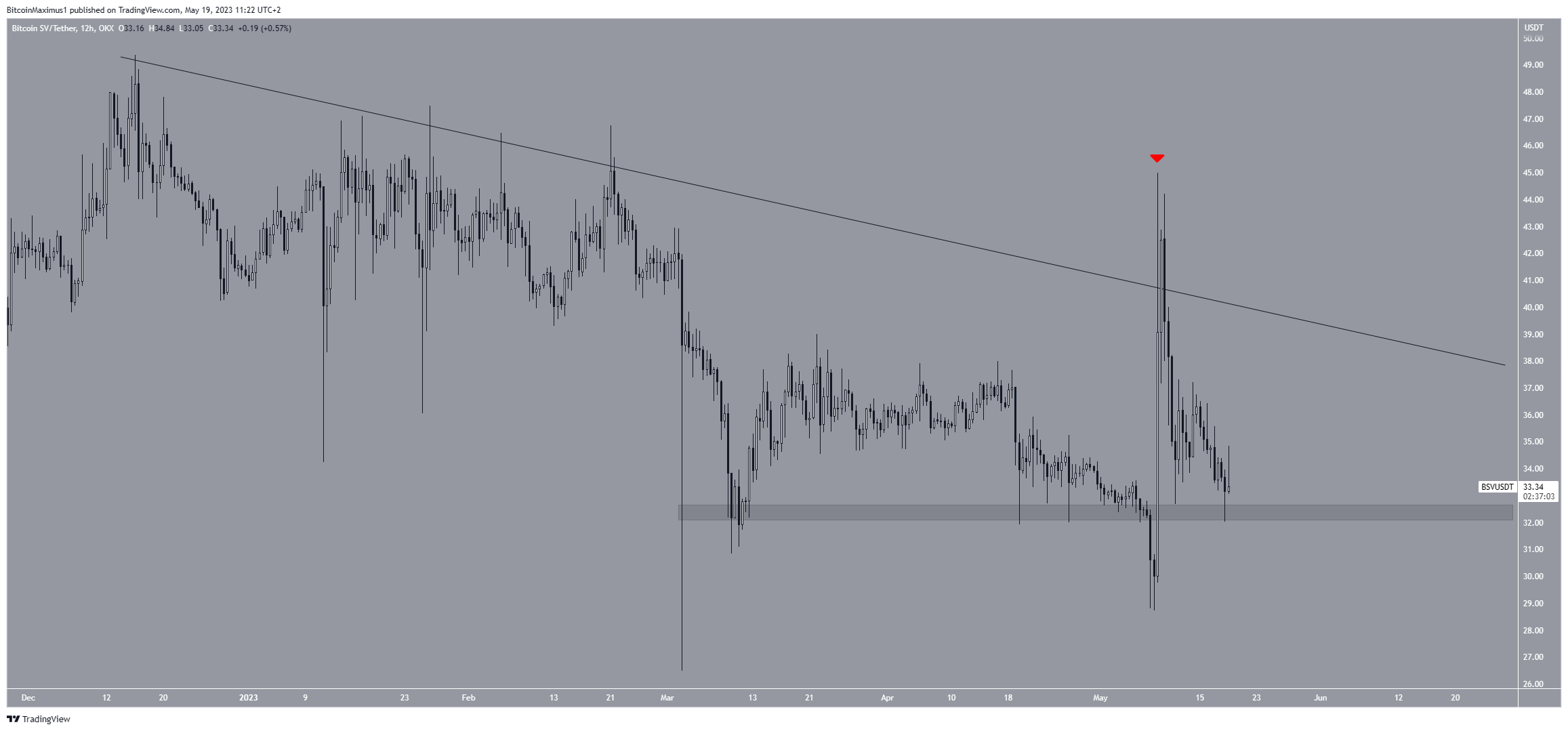 O BSV caiu abaixo de uma linha de resistência descendente desde dezembro de 2022. Mais recentemente, a linha causou uma rejeição em 9 de maio (ícone vermelho).