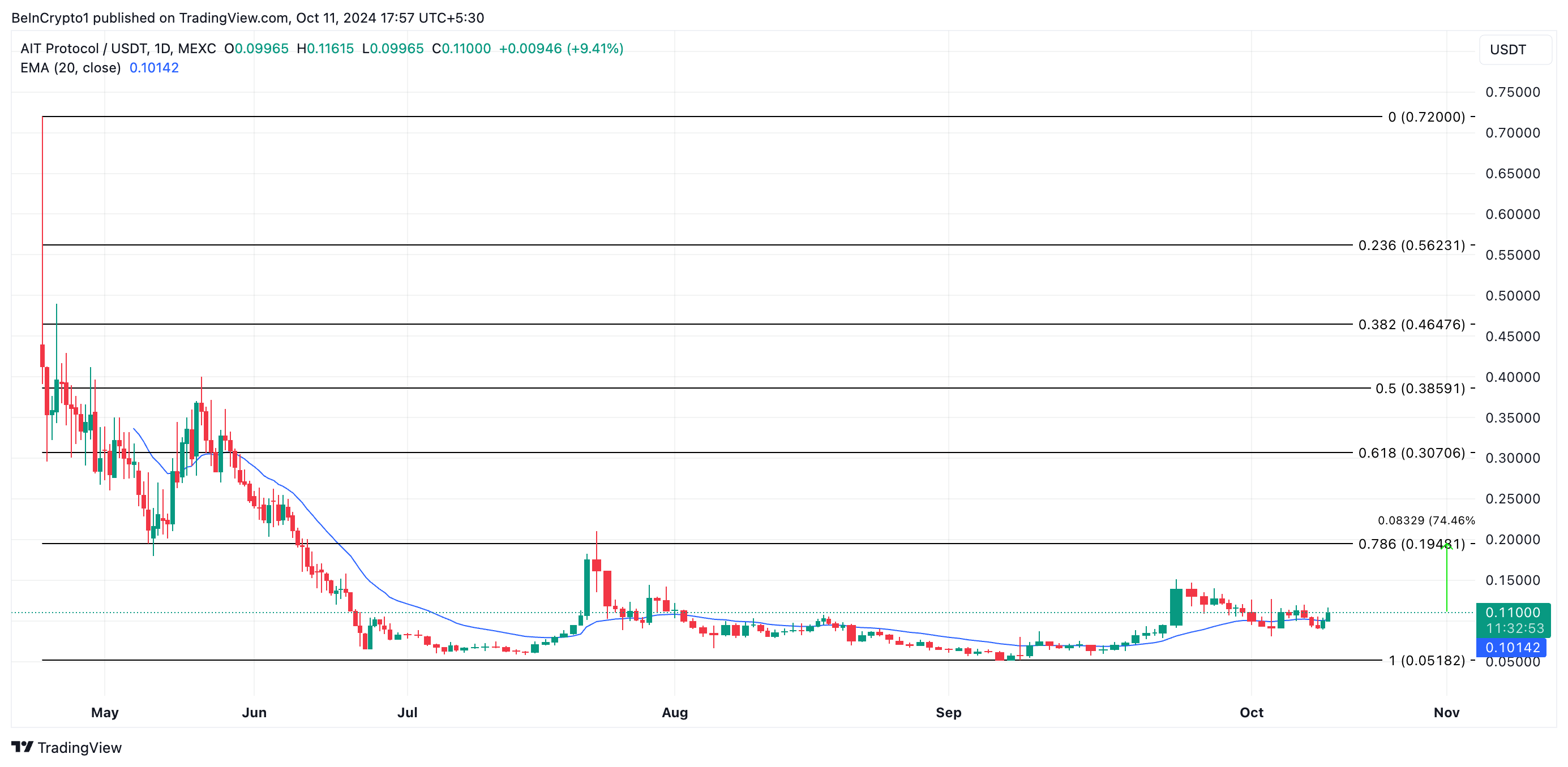 Dessa maneira, os traders veem isso como um sinal de uma tendência de alta de curto a médio prazo. Portanto, se AIT mantiver isso, o preço da criptomoeda de IA subirá 74% sendo negociado a US$ 0,19.