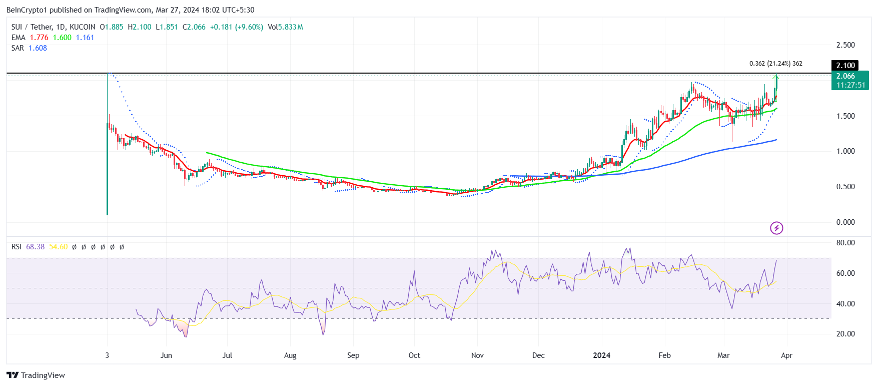 O Índice de Força Relativa (RSI), um oscilador de momentum que mede a velocidade e a mudança dos movimentos de preços, também está na zona de alta. Isso sugere que o ativo digital ainda não está sobrecomprado e pode ultrapassar US$ 2.10 no início de abril.