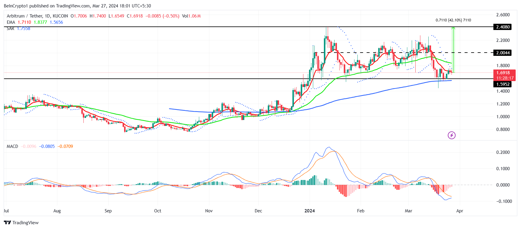A alta de todos os tempos está agora 42% longe do token, e o ARB precisaria inverter a MME de 50 e 100 dias para chegar a US $ 2. Este nível de suporte fornecerá o impulso necessário para subir para US$ 2.40.