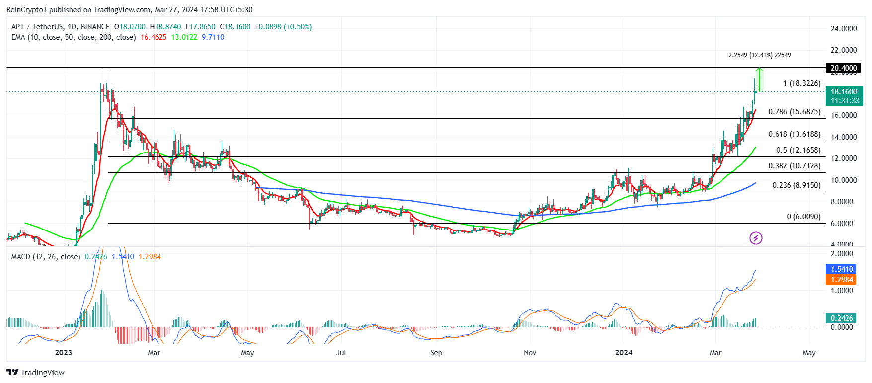 O preço da Aptos subiu da baixa de US$ 9 para quase o dobro do valor, já que a altcoin pode ser vista mudando de mãos a US$ 18,6 no momento. Essa alta só continuará à medida que entrarmos no segundo trimestre, já que o APT está a menos de 12,5% de romper o recorde histórico anterior de US$ 20,40 de janeiro de 2023.