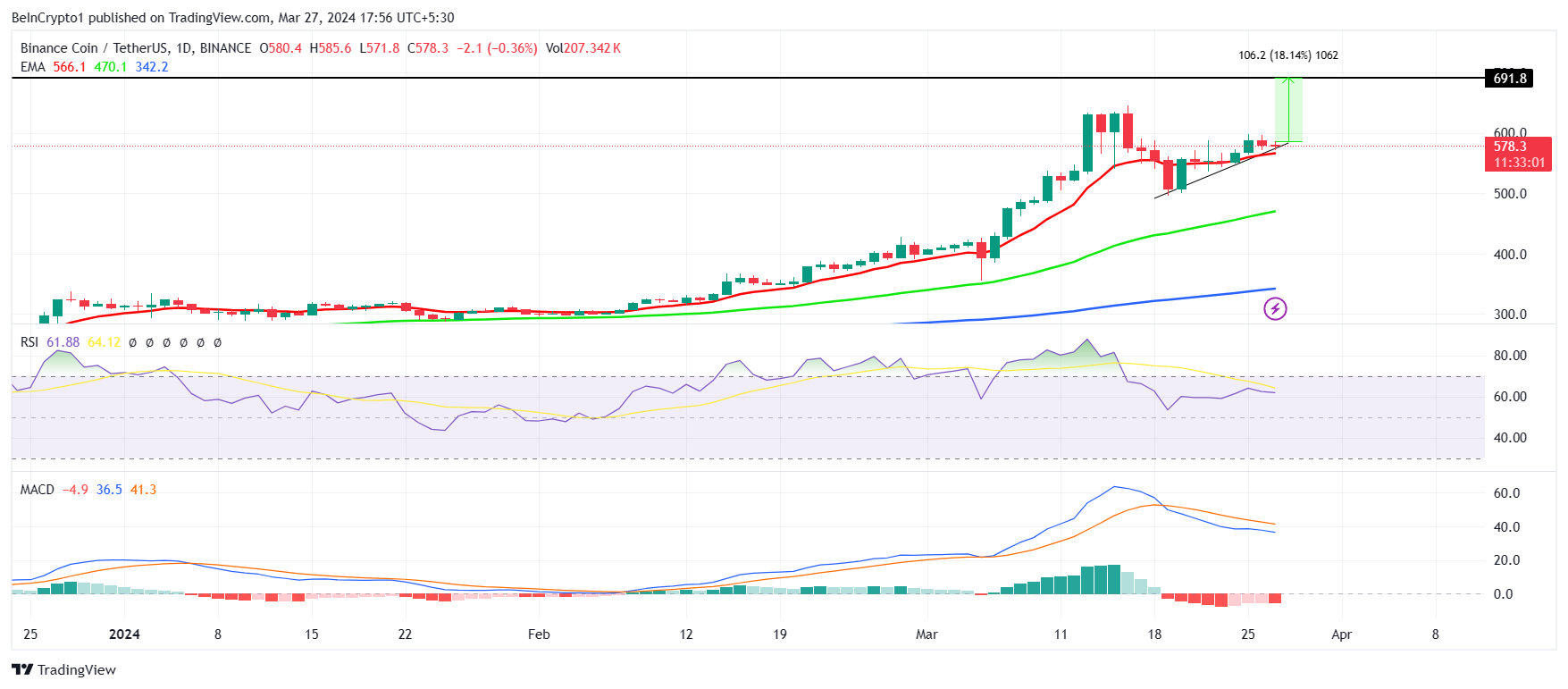 O BNB está atualmente em uma inclinação de curto prazo, aproximando-se da máxima de US$ 691. O token nativo da Binance está a cerca de 18,14% de distância do ponto de preço, o que exigiria que o BNB fechasse acima da marca de US$ 600 primeiro.