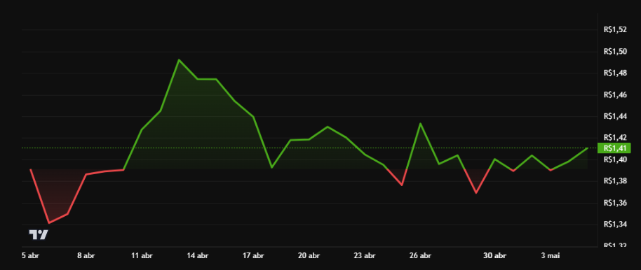 Atualmente, o preço da TRX/BRL está cotado em R$1,41. A moeda apresenta capitalização de mercado de R$133,95 bilhões e volume diário de negociação de R$610,34 milhões, com leve alta de 0,41% nas últimas 24 horas.