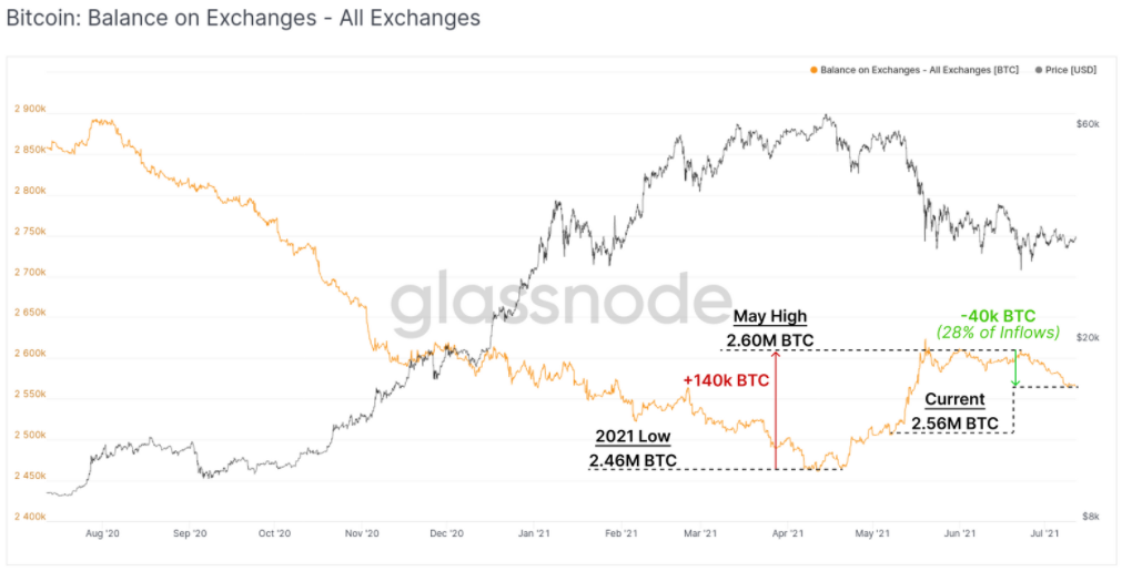 A Glassnode também informou que o saldo total de Bitcoin nas exchanges diminuiu em 40.000 unidades nas últimas três semanas. O montante representa 28% do fornecimento durante a baixa atual, que foi definida em abril.