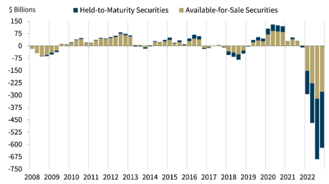 Portanto, o segundo maior banco dos Estados Unidos, com US$ 2,5 trilhões em ativos totais, pode ser forçado a vender esses títulos com prejuízo se os depositantes quiserem seu dinheiro. Foi o que aconteceu com o SVB e o First Republic Bank.
