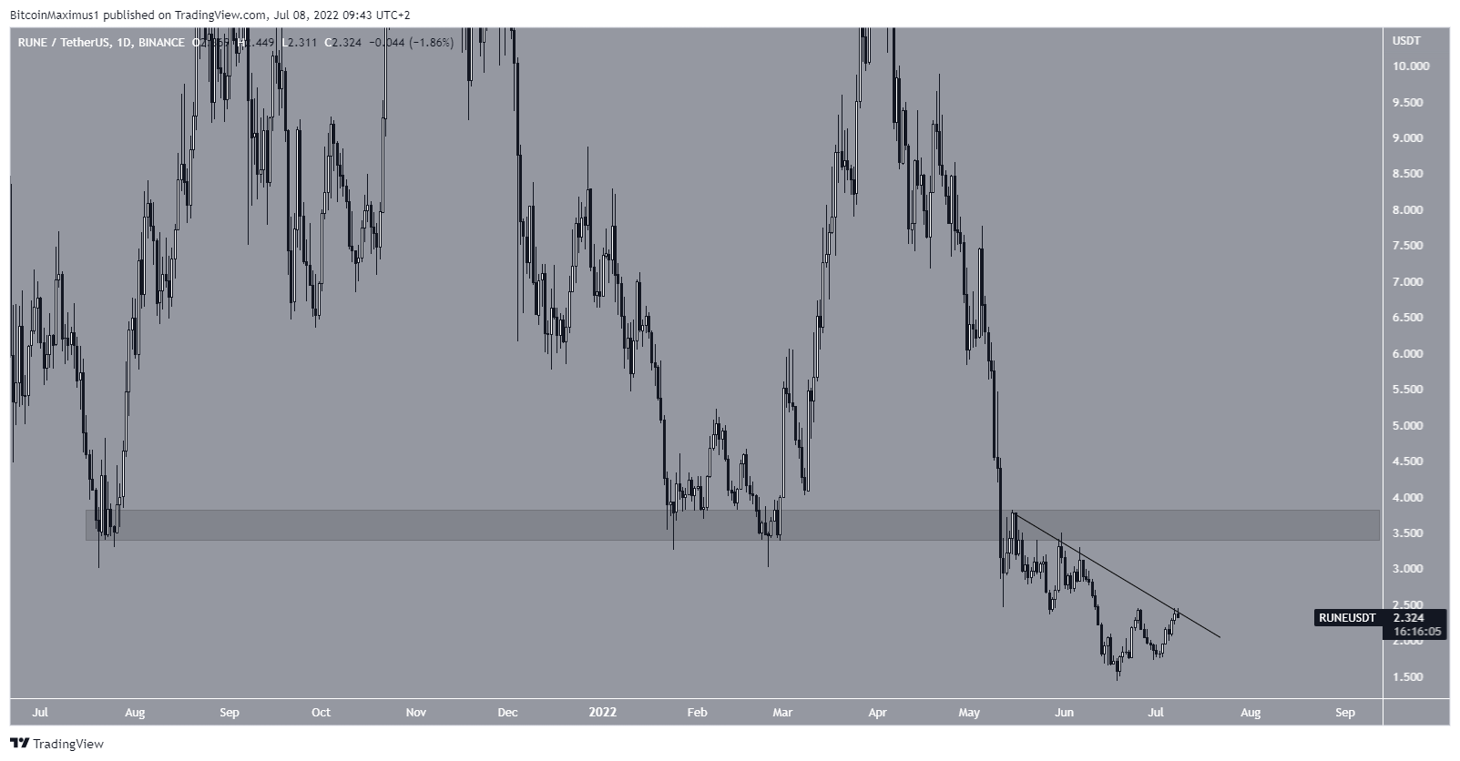 O preço da RUNE está subindo desde 18 de junho e criou um topo mais alto que o anterior na última terça-feira. Atualmente, ela está fazendo sua quarta tentativa de romper acima de uma linha de tendência de baixa.
