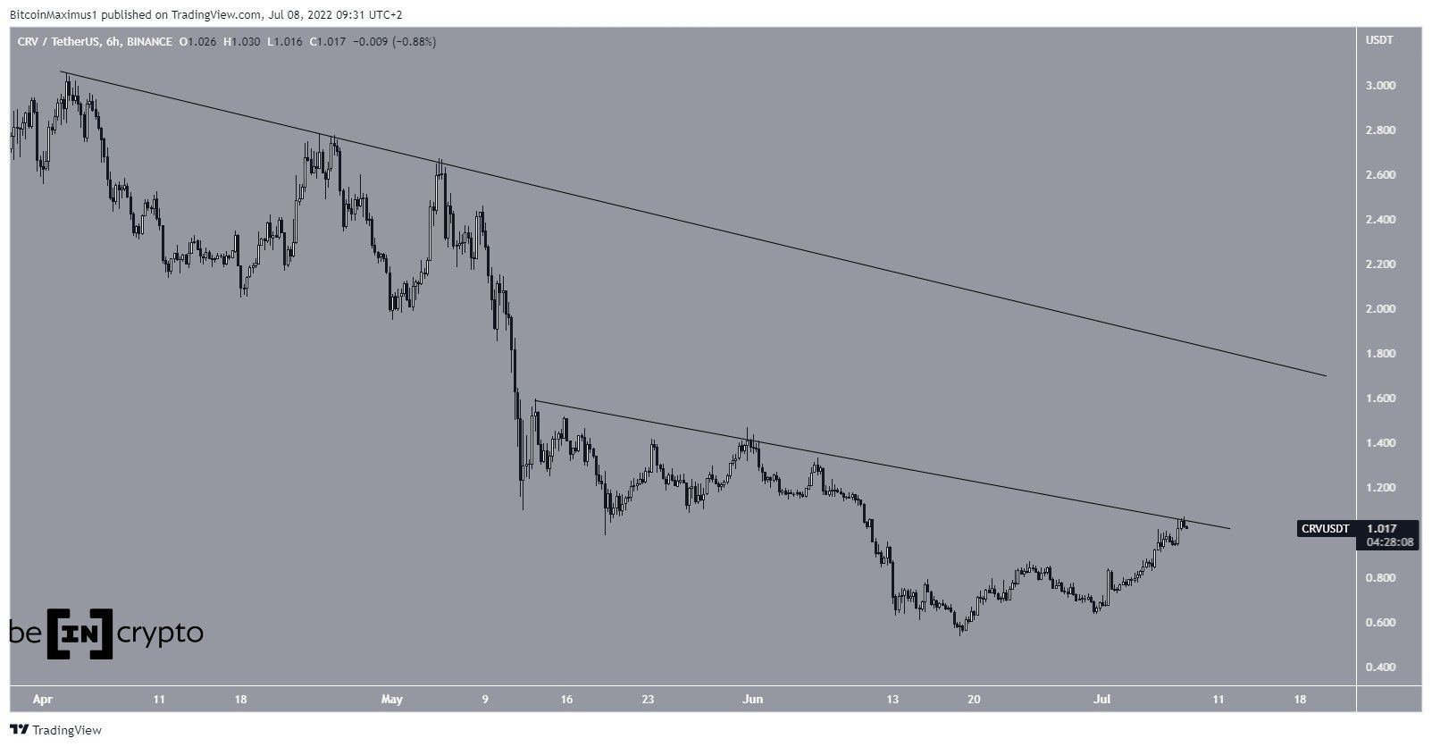 A CRV vem subindo desde que atingiu uma mínima de US$ 0,535 em 18 de junho. O movimento até agora levou a uma alta de US$ 1,02. Isso fez com que o token tocasse em uma linha de tendência de baixa que está em vigor desde 11 de maio.