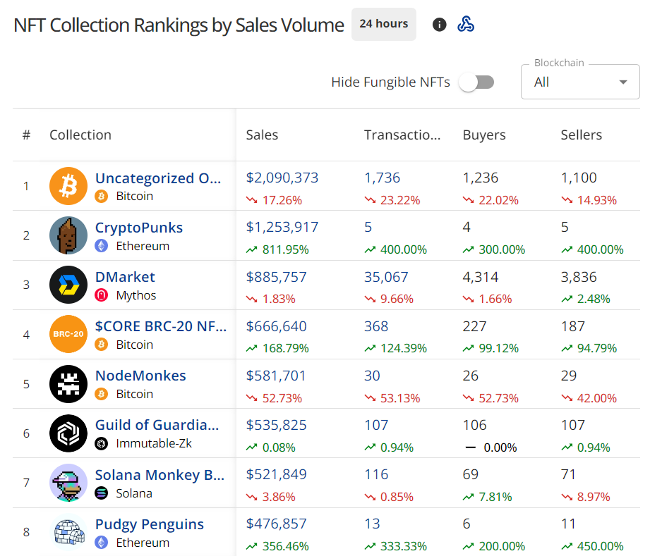 No mercado de tokens não fungíveis (NFTs), CryptoPunks e Pudgy Penguins, colecionáveis NFT baseados em Ethereum (ETH), surgiram surpreendentemente como líderes em vendas nas últimas 24 horas.