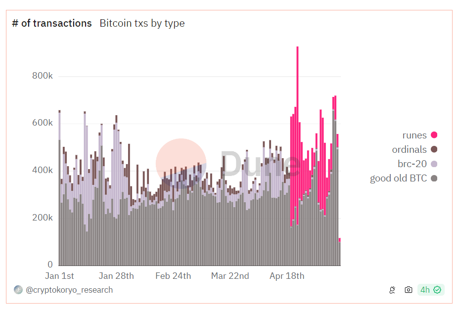 No entanto, o hype das Runas esfriou logo após o halving do Bitcoin. Os dados da Dune Analytics mostram uma queda significativa nas transações de Runes. Elas caíram quase 4.590%, de 753.814 em 24 de abril para 16.066 em 13 de maio.
